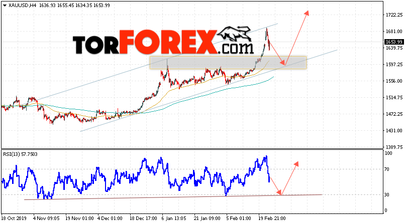 Дополнительным сигналом в пользу роста котировок XAU/USD выступит тест пробитой линии тренда на индикаторе относительной силы. Вторым сигналом станет отскок от нижней границы восходящего канала. Отменой варианта роста цен на Золото 26 февраля 2020 станет падение и пробой уровня 1595. Это укажет на пробой области поддержки и продолжение падения в область ниже уровня 1525. Ожидать ускорения роста котировок XAU/USD стоит с пробоем области сопротивления и закрытием над уровнем 1705.
