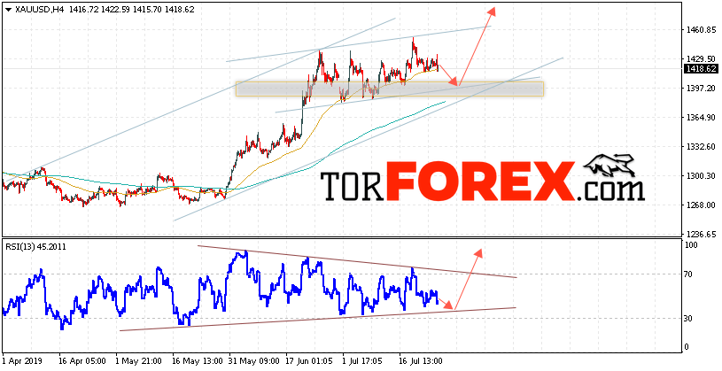 Таким образом, XAU/USD прогноз цен на Золото на 26 июля 2019 предполагает попытку теста области поддержки вблизи уровня 1395. Далее, продолжение роста котировок с целью выше уровня 1470. Отменой варианта подъёма цен на Золото выступит падение и пробой уровня 1385. Это укажет на пробой нижней границы модели «Треугольник». В этом случае стоит ожидать продолжения снижения Золота ниже уровня 1355.