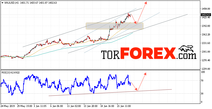 Таким образом, XAU/USD прогноз цен на Золото на 26 июня 2019 предполагает попытку теста области поддержки вблизи уровня 1400. Далее, продолжение роста котировок с целью выше уровня 1465. Отменой варианта подъёма цен на Золото выступит падение и пробой уровня 1370. Это укажет на пробой нижней границы канала. В этом случае стоит ожидать продолжения снижения Золота ниже уровня 1335.