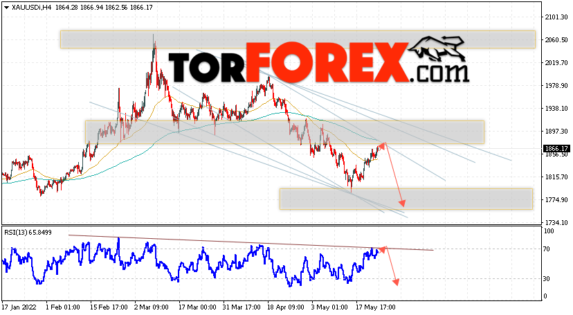Дополнительным сигналом в пользу падения котировок XAU/USD выступит тест линии сопротивления на индикаторе относительной силы. Вторым сигналом станет отскок от верхней границы нисходящего канала. Отменой варианта подъёма цен на Золото 26 мая 2022 станет сильный рост и пробой уровня 1925. Это укажет на пробой области сопротивления и продолжение подъёма в область выше уровня 1975. Ожидать ускорения падения котировок XAU/USD стоит с пробоем области поддержки и закрытием цены под уровнем 1815.