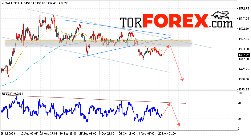 Дополнительным сигналом в пользу снижения котировок XAU/USD выступит тест линии тренда на индикаторе относительной силы. Вторым сигналом в пользу падения цен на Золото станет отскок от верхней границы нисходящего канала. Отменой варианта снижения цен на Золото 27 ноября 2019 станет сильный рост и пробой уровня 1505. Это укажет на пробой области сопротивления и продолжение роста в область выше уровня 1565. Ожидать ускорения падения котировок XAU/USD стоит с пробоем области поддержки и закрытием под уровнем 1435.