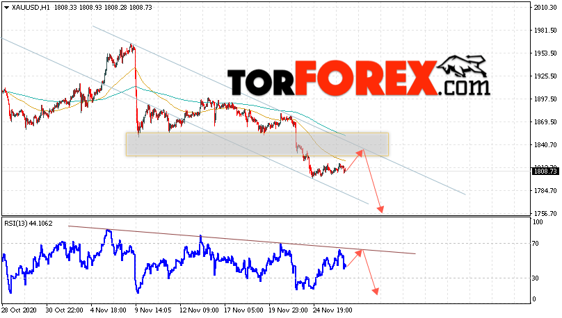 Дополнительным сигналом в пользу снижения котировок XAU/USD выступит тест линии сопротивления на индикаторе относительной силы. Вторым сигналом станет отскок от верхней границы нисходящего канала. Отменой варианта падения цен на Золото 27 ноября 2020 станет сильный рост и пробой уровня 1865. Это укажет на пробой области сопротивления и продолжение роста в область выше уровня 1935. Ожидать ускорения падения котировок XAU/USD стоит с пробоем области поддержки и закрытием цены под уровнем 1780.