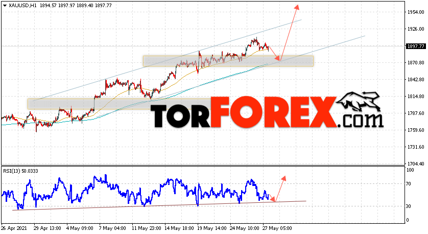 Дополнительным сигналом в пользу роста котировок XAU/USD выступит тест линии тренда на индикаторе относительной силы. Вторым сигналом станет отскок от нижней границы восходящего канала. Отменой варианта подъёма цен на Золото 28 мая 2021 станет падение и пробой уровня 1855. Это укажет на пробой области поддержки и продолжение снижения в область ниже уровня 1775. Ожидать ускорения подъёма котировок XAU/USD стоит с пробоем области сопротивления и закрытием цены над уровнем 1925.
