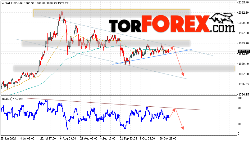 Дополнительным сигналом в пользу падения котировок XAU/USD выступит тест линии сопротивления на индикаторе относительной силы. Вторым сигналом станет отскок от верхней границы нисходящего канала. Отменой варианта падения цен на Золото 28 октября 2020 станет сильный рост и пробой уровня 1945. Это укажет на пробой области сопротивления и продолжение роста в область выше уровня 1975. Ожидать ускорения падения котировок XAU/USD стоит с пробоем области поддержки и закрытием цены под уровнем 1865, такое падение укажет на завершение формирования разворотной модели ”Голова и плечи” и начала отработки данной модели.