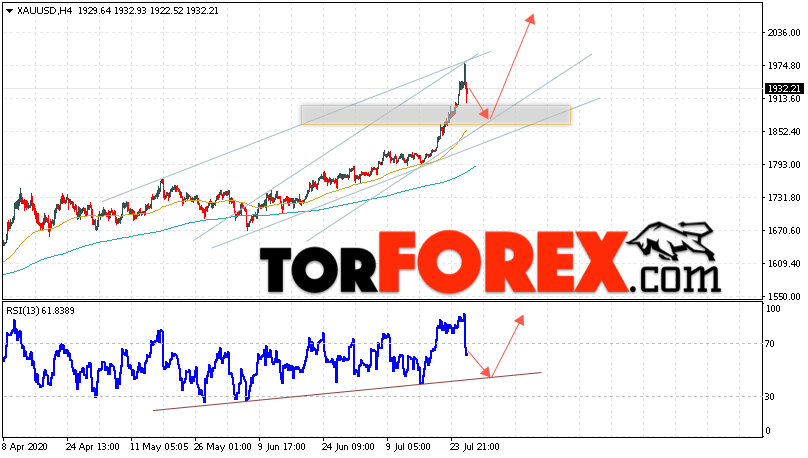 Дополнительным сигналом в пользу подъёма котировок XAU/USD выступит тест линии тренда на индикаторе относительной силы. Вторым сигналом отскок от нижней границы восходящего канала. Отменой варианта роста цен на Золото 29 июля 2020 станет падение и пробой уровня 1845. Это укажет на пробой области поддержки и продолжение падения в область ниже уровня 1805. Ожидать ускорения роста котировок XAU/USD стоит с пробоем области сопротивления и закрытием над уровнем 1995.