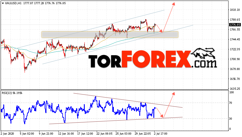 Дополнительным сигналом в пользу подъёма котировок XAU/USD выступит тест линии тренда на индикаторе относительной силы. Вторым сигналом отскок от нижней границы восходящего канала. Отменой варианта роста цен на Золото 3 июля 2020 станет падение и пробой уровня 1740. Это укажет на пробой области поддержки и продолжение падения в область ниже уровня 1695. Ожидать ускорения роста котировок XAU/USD стоит с пробоем области сопротивления и закрытием над уровнем 1795.