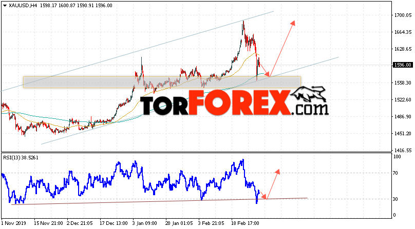 Дополнительным сигналом в пользу роста котировок XAU/USD выступит тест линии тренда на индикаторе относительной силы. Вторым сигналом станет отскок от нижней границы восходящего канала. Отменой варианта роста цен на Золото 3 марта 2020 станет падение и пробой уровня 1545. Это укажет на пробой области поддержки и продолжение падения в область ниже уровня 1505. Ожидать ускорения роста котировок XAU/USD стоит с пробоем области сопротивления и закрытием над уровнем 1625.