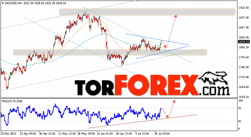 Дополнительным сигналом в пользу подъёма котировок XAU/USD выступит тест бычьей линии тренда на индикаторе относительной силы. Вторым сигналом станет отскок от нижней границы восходящего канала. Отменой варианта роста цен на Золото 30 июля 2021 станет падение и пробой уровня 1775. Это укажет на пробой области поддержки и продолжение падения в область ниже уровня 1725. Ожидать ускорения подъёма котировок XAU/USD стоит с пробоем области сопротивления и закрытием цены над уровнем 1845, что укажет на пробой верхней границы модели ”Треугольник».