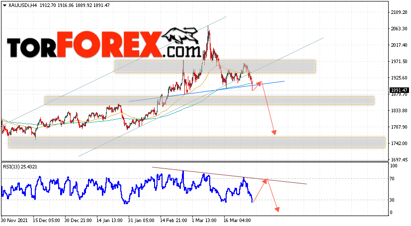 Дополнительным сигналом в пользу падения котировок XAU/USD выступит тест линии сопротивления на индикаторе относительной силы. Вторым сигналом станет отскок от нижней границы разворотной модели ”Голова и плечи”. Отменой варианта падения цен на Золото 30 марта 2022 станет сильный рост и пробой уровня 1975. Это укажет на пробой области сопротивления и продолжение роста в область выше уровня 2045. Ожидать ускорения падения котировок XAU/USD стоит с пробоем области поддержки и закрытием цены под уровнем 1875.