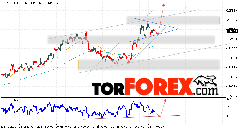 Дополнительным сигналом в пользу снижения котировок XAU/USD выступит тест линии сопротивления на индикаторе относительной силы. Вторым сигналом станет отскок от нижней границы модели ”Треугольник”. Отменой варианта падения цен на Золото 30 марта 2023 станет сильный рост и пробой уровня 1915. Это укажет на пробой области сопротивления и продолжение роста в область выше уровня 1875. Ожидать ускорения роста котировок XAU/USD стоит с пробоем области сопротивления и закрытием цены над уровнем 2015, что укажет на пробой верхней границы модели ”Треугольник” и начало отработки паттерна с целями вверху.