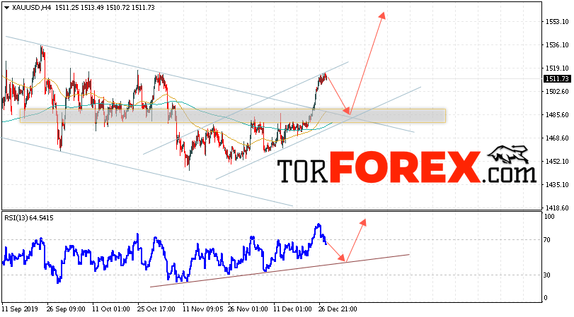 Дополнительным сигналом в пользу роста котировок XAU/USD выступит тест восходящей линии тренда на индикаторе относительной силы. Вторым сигналом в пользу подъёма цен на Золото станет отскок от нижней границы восходящего канала. Отменой варианта роста цен на Золото 31 декабря 2019 станет падение и пробой уровня 1465. Это укажет на пробой области поддержки и продолжение падения в область ниже уровня 1425. Ожидать ускорения роста котировок XAU/USD стоит с пробоем области сопротивления и закрытием над уровнем 1525.