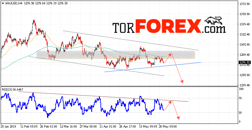 В пользу снижения котировок XAU/USD выступит тест нисходящей линии тренда на индикаторе относительной силы. Вторым сигналом станет отскок от верхней границы нисходящего канала. Отменой варианта подъёма цен на Золото 31 мая 2019 станет падение и пробой уровня 1305. Это укажет на пробой верхней границы канала и продолжение роста в область выше уровня 1355. Ожидать ускорения падения котировок XAU/USD стоит с пробоем области поддержки и закрытием ниже уровня 1265. Это укажет на завершение формирования Форекс-модели.