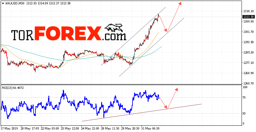 В пользу снижения котировок XAU/USD выступит тест восходящей линии тренда на индикаторе относительной силы. Вторым сигналом станет отскок от нижней границы восходящего канала. Отменой варианта подъёма цен на Золото 4 июня 2019 станет падение и пробой уровня 1295. Это укажет на пробой нижней границы канала и продолжение падения в область ниже уровня 1245. Ожидать ускорения роста котировок XAU/USD стоит с пробоем области сопротивления и закрытием выше уровня 1315.