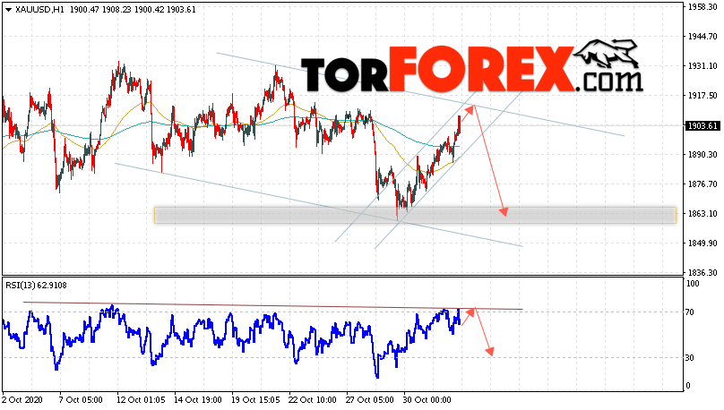 Дополнительным сигналом в пользу падения котировок XAU/USD выступит тест линии сопротивления на индикаторе относительной силы. Вторым сигналом станет отскок от верхней границы нисходящего канала. Отменой варианта падения цен на Золото 4 ноября 2020 станет сильный рост и пробой уровня 1925. Это укажет на пробой области сопротивления и продолжение роста в область выше уровня 1965. Ожидать ускорения падения котировок XAU/USD стоит с пробоем области поддержки и закрытием цены под уровнем 1885, что укажет на пробой нижней границы восходящего канала.