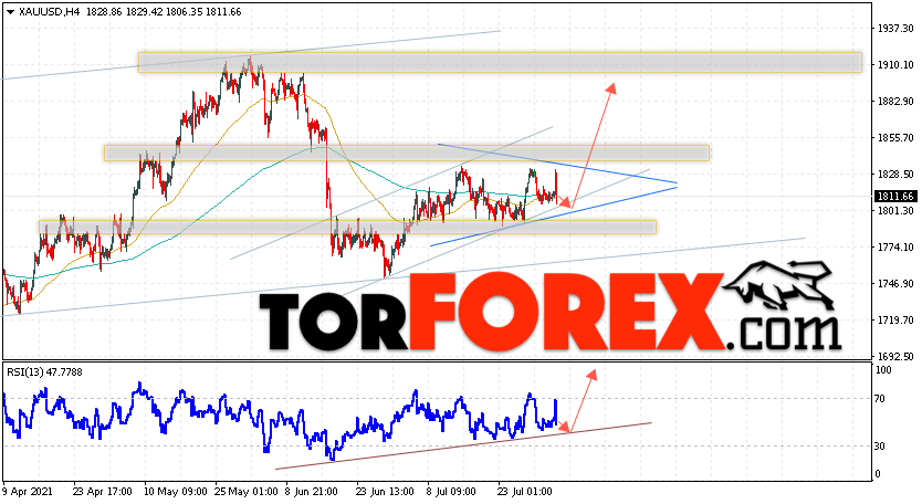 Дополнительным сигналом в пользу подъёма котировок XAU/USD выступит тест бычьей линии тренда на индикаторе относительной силы. Вторым сигналом станет отскок от нижней границы восходящего канала. Отменой варианта роста цен на Золото 5 августа 2021 станет падение и пробой уровня 1775. Это укажет на пробой области поддержки и продолжение падения в область ниже уровня 1735. Ожидать ускорения подъёма котировок XAU/USD стоит с пробоем области сопротивления и закрытием цены над уровнем 1855, что укажет на пробой верхней границы модели ”Треугольник”.