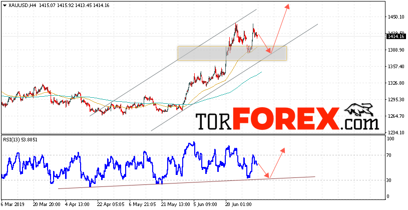 Таким образом, XAU/USD прогноз цен на Золото на 5 июля 2019 предполагает попытку теста области поддержки вблизи уровня 1400. Далее, продолжение роста котировок с целью выше уровня 1465. Отменой варианта подъёма цен на Золото выступит падение и пробой уровня 1375. Это укажет на пробой нижней границы канала. В этом случае стоит ожидать продолжения снижения Золота ниже уровня 1310.