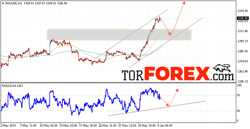 В пользу снижения котировок XAU/USD выступит тест восходящей линии поддержки на индикаторе относительной силы. Вторым сигналом станет отскок от нижней границы восходящего канала. Отменой варианта подъёма цен на Золото 5 июня 2019 станет падение и пробой уровня 1295. Это укажет на пробой нижней границы канала и продолжение падения в область ниже уровня 1245. Ожидать ускорения роста котировок XAU/USD стоит с пробоем области сопротивления и закрытием выше уровня 1335.