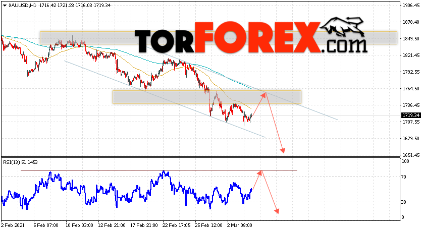 Дополнительным сигналом в пользу падения котировок XAU/USD выступит тест линии сопротивления на индикаторе относительной силы. Вторым сигналом станет отскок от верхней границы нисходящего канала. Отменой варианта падения цен на Золото 5 марта 2021 станет сильный рост и пробой уровня 1785. Это укажет на пробой области сопротивления и продолжение подъёма в область выше уровня 1845. Ожидать ускорения падения котировок XAU/USD стоит с пробоем области поддержки и закрытием цены под уровнем 1685.