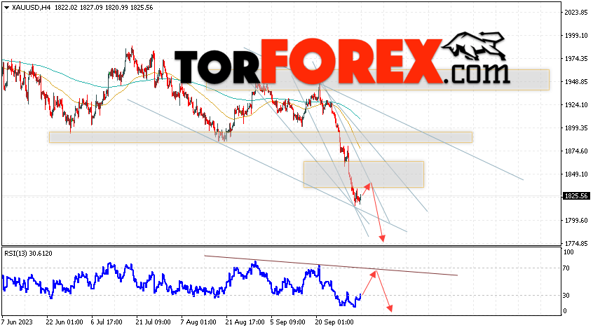 Дополнительным сигналом в пользу подъёма котировок XAU/USD выступит тест линии поддержки на индикаторе относительной силы. Вторым сигналом станет отскок от верхней границы медвежьего канала. Отменой варианта снижения цен на Золото 5 октября 2023 станет сильный рост и пробой уровня 1855. Это укажет на пробой области сопротивления и продолжение роста котировок актива в область выше уровня 1895. Ожидать ускорения падения котировок XAU/USD стоит с пробоем области поддержки и закрытием цены под уровнем 1795.