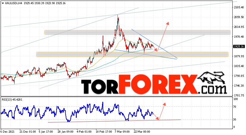 Дополнительным сигналом в пользу подъёма котировок XAU/USD выступит тест линии поддержки на индикаторе относительной силы. Вторым сигналом станет отскок от нижней границы бычьего канала. Отменой варианта подъёма цен на Золото 6 апреля 2022 станет падение и пробой уровня 1870. Это укажет на пробой области поддержки и продолжение падения в область ниже уровня 1825. Ожидать ускорения подъёма котировок XAU/USD стоит с пробоем области сопротивления и закрытием цены над уровнем 1945, что укажет на пробой верхней границы модели ”Клин”.