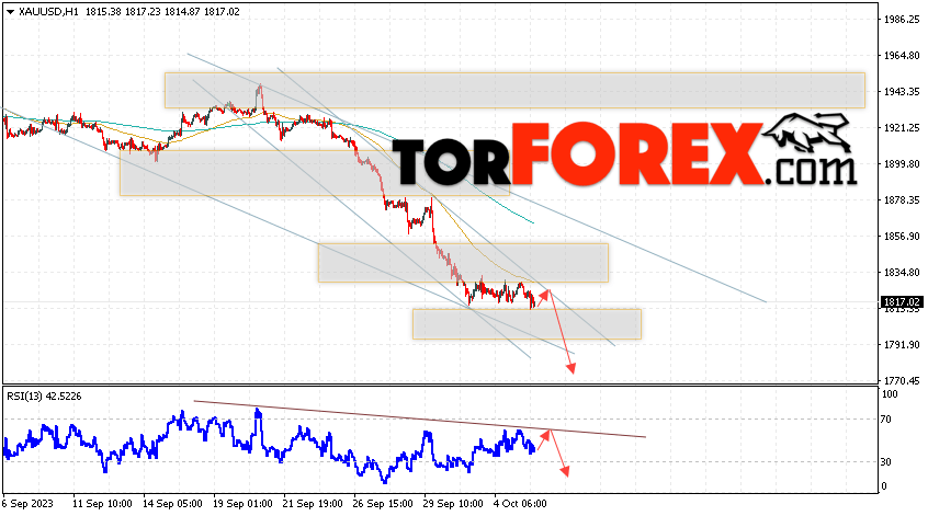 Дополнительным сигналом в пользу подъёма котировок XAU/USD выступит тест линии поддержки на индикаторе относительной силы. Вторым сигналом станет отскок от верхней границы медвежьего канала. Отменой варианта снижения цен на Золото 6 октября 2023 станет сильный рост и пробой уровня 1845. Это укажет на пробой области сопротивления и продолжение роста котировок актива в область выше уровня 1885. Ожидать ускорения падения котировок XAU/USD стоит с пробоем области поддержки и закрытием цены под уровнем 1805.