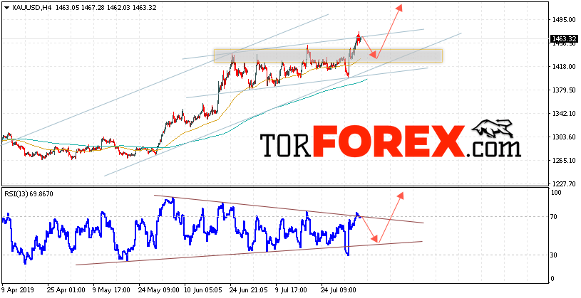 В пользу подъема котировок XAU/USD выступит тест линии поддержки на индикаторе относительной силы. Вторым сигналом станет отскок от нижней границы восходящего канала. Отменой варианта роста цен на Золото 7 августа 2019 станет падение и пробой уровня 1405. Это укажет на пробой нижнем границы канала и продолжение падения в область ниже уровня 1355. Ожидать ускорения роста котировок XAU/USD стоит с пробоем верхней границы восходящего канала и закрытием над уровнем 1490.