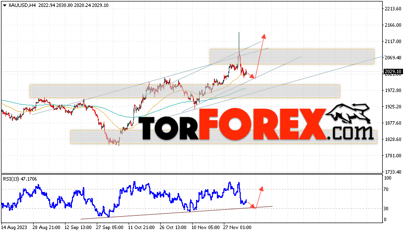 Дополнительным сигналом в пользу подъёма котировок XAU/USD выступит тест линии поддержки на индикаторе относительной силы. Вторым сигналом станет отскок от нижней границы бычьего канала. Отменой варианта роста цен на Золото 7 декабря 2023 станет падение цен и пробой уровня 1965. Это укажет на пробой области поддержки и продолжение падения котировок актива в область ниже уровня 1915. Ожидать ускорения роста котировок XAU/USD стоит с пробоем области сопротивления и закрытием цены над уровнем 2045.