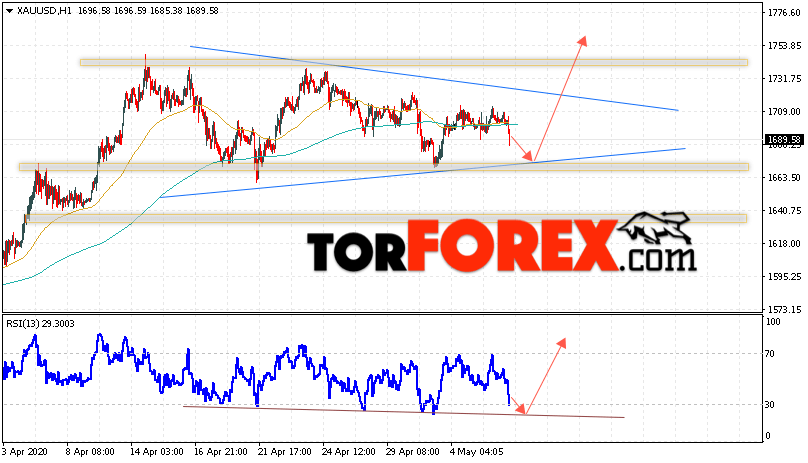 Дополнительным сигналом в пользу подъёма котировок XAU/USD выступит тест линии тренда на индикаторе относительной силы. Вторым сигналом станет отскок от нижней границы модели «Треугольник». Отменой варианта роста цен на Золото 7 мая 2020 станет падение и пробой уровня 1655. Это укажет на пробой области поддержки и продолжение падения в область ниже уровня 1615. Ожидать ускорения роста котировок XAU/USD стоит с пробоем области сопротивления и закрытием над уровнем 1735.
