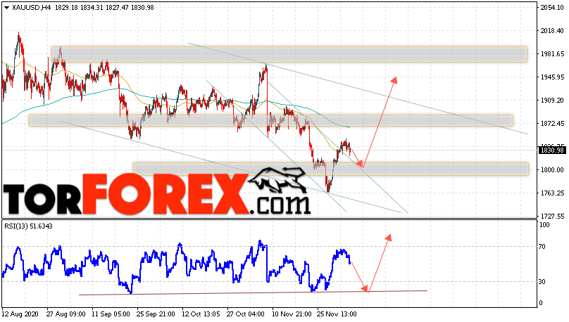 Дополнительным сигналом в пользу роста котировок XAU/USD выступит тест линии поддержки на индикаторе относительной силы. Вторым сигналом станет отскок от верхней границы нисходящего канала. Отменой варианта роста цен на Золото 8 декабря 2020 станет падение и пробой уровня 1775. Это укажет на пробой области поддержки и продолжение падения в область ниже уровня 1735. Ожидать ускорения роста котировок XAU/USD стоит с пробоем области сопротивления и закрытием цены над уровнем 1855.