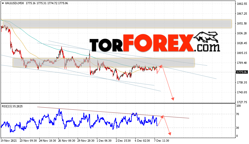 Дополнительным сигналом в пользу снижения котировок XAU/USD выступит тест линии сопротивления на индикаторе относительной силы. Вторым сигналом станет отскок от верхней границы нисходящего канала. Отменой варианта падения цен на Золото 8 декабря 2021 станет сильный рост и пробой уровня 1805. Это укажет на пробой области сопротивления и продолжение роста в область выше уровня 1845. Ожидать ускорения падения котировок XAU/USD стоит с пробоем области поддержки и закрытием цены под уровнем 1755.
