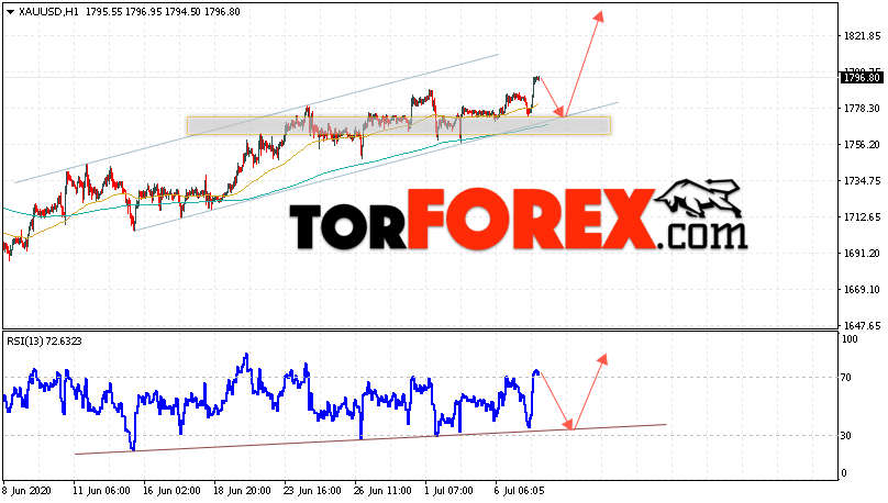 Дополнительным сигналом в пользу подъёма котировок XAU/USD выступит тест линии тренда на индикаторе относительной силы. Вторым сигналом отскок от нижней границы восходящего канала. Отменой варианта роста цен на Золото 8 июля 2020 станет падение и пробой уровня 1750. Это укажет на пробой области поддержки и продолжение падения в область ниже уровня 1705. Ожидать ускорения роста котировок XAU/USD стоит с пробоем области сопротивления и закрытием над уровнем 1815.