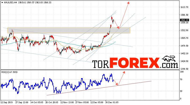 Дополнительным сигналом в пользу роста котировок XAU/USD выступит тест восходящей линии тренда на индикаторе относительной силы. Вторым сигналом в пользу подъёма цен на Золото станет отскок от верхней границы нисходящего канала. Отменой варианта роста цен на Золото 8 января 2020 станет падение и пробой уровня 1505. Это укажет на пробой области поддержки и продолжение падения в область ниже уровня 1475. Ожидать ускорения роста котировок XAU/USD стоит с пробоем области сопротивления и закрытием над уровнем 1595.