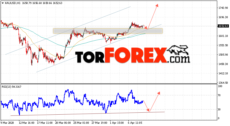 Дополнительным сигналом в пользу подъёма котировок XAU/USD выступит тест линии тренда на индикаторе относительной силы. Вторым сигналом станет отскок от нижней границы восходящего канала. Отменой варианта роста цен на Золото 8 апреля 2020 станет падение и пробой уровня 1605. Это укажет на пробой области поддержки и продолжение падения в область ниже уровня 1565. Ожидать ускорения роста котировок XAU/USD стоит с пробоем области сопротивления и закрытием над уровнем 1685.