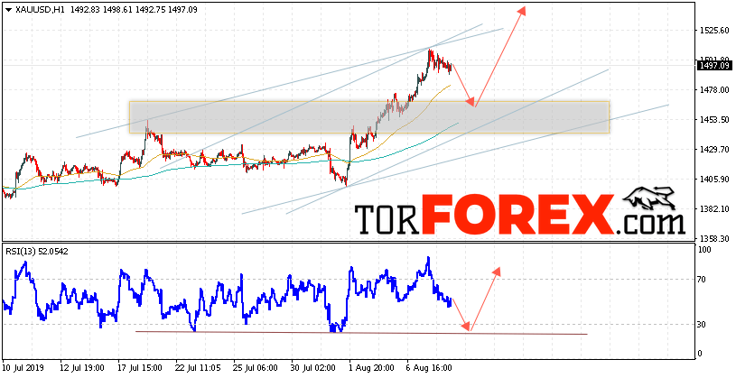 В пользу подъема котировок XAU/USD выступит тест линии поддержки на индикаторе относительной силы. Вторым сигналом станет отскок от нижней границы восходящего канала. Отменой варианта роста цен на Золото 9 августа 2019 станет падение и пробой уровня 1425. Это укажет на пробой нижней границы канала и продолжение падения в область ниже уровня 1375. Ожидать ускорения роста котировок XAU/USD стоит с пробоем верхней границы восходящего канала и закрытием над уровнем 1535.