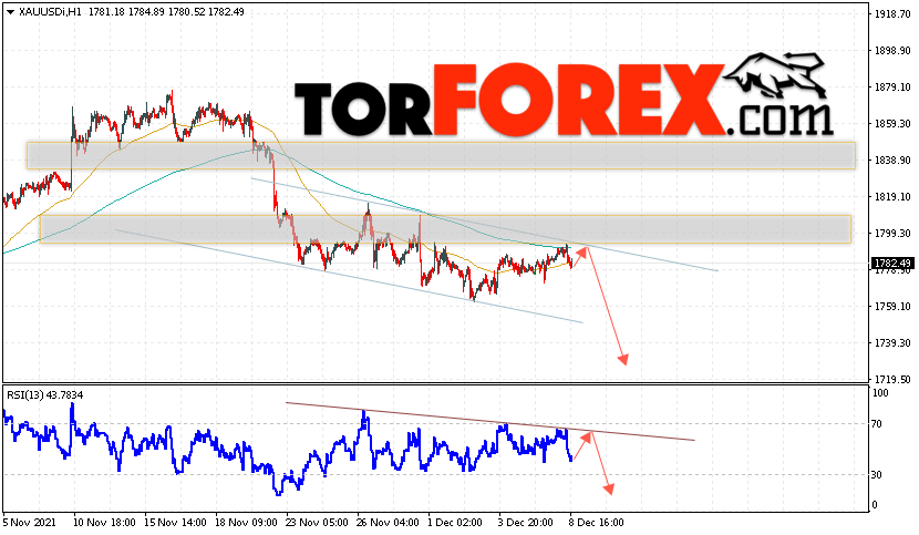 Дополнительным сигналом в пользу снижения котировок XAU/USD выступит тест линии сопротивления на индикаторе относительной силы. Вторым сигналом станет отскок от верхней границы нисходящего канала. Отменой варианта падения цен на Золото 9 декабря 2021 станет сильный рост и пробой уровня 1805. Это укажет на пробой области сопротивления и продолжение роста в область выше уровня 1855. Ожидать ускорения падения котировок XAU/USD стоит с пробоем области поддержки и закрытием цены под уровнем 1760.