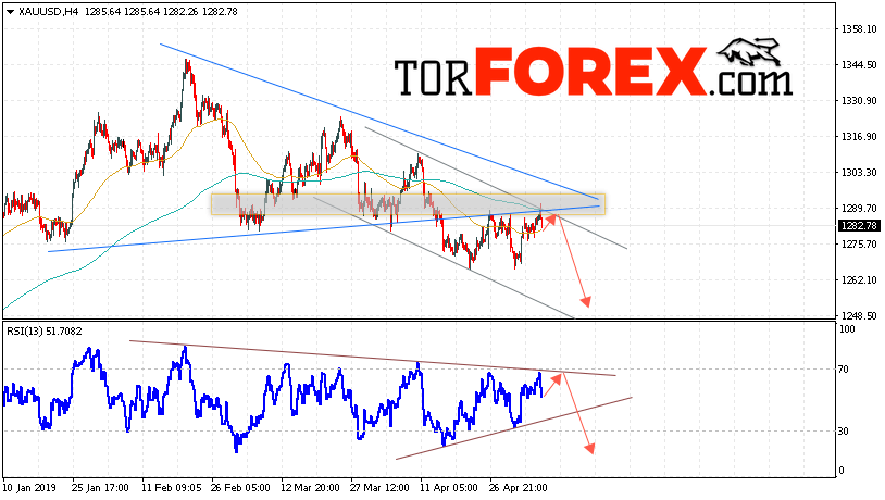 В пользу снижения котировок XAU/USD выступит тест линии тренда на индикаторе относительной силы. Вторым сигналом станет отскок от верхней границы модели «Треугольник». Отменой варианта падения цен на Золото 9 мая 2019 станет сильный рост и пробой уровня 1295. Это укажет на пробой верхней границы канала и продолжение роста в область выше уровня 1335. Ожидать ускорения падения котировок XAU/USD стоит с пробоем области поддержки и закрытием ниже уровня 1265.
