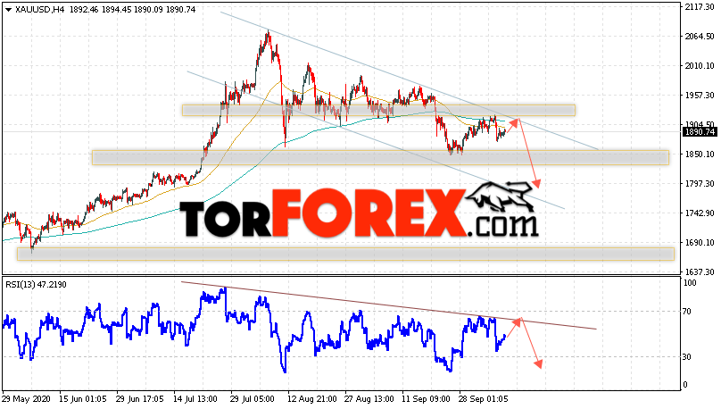 Дополнительным сигналом в пользу падения котировок XAU/USD выступит тест нисходящей линии тренда на индикаторе относительной силы. Вторым сигналом станет отскок от верхней границы нисходящего канала. Отменой варианта падения цен на Золото 9 октября 2020 станет сильный рост и пробой уровня 1945. Это укажет на пробой области сопротивления и продолжение роста в область выше уровня 1985. Ожидать ускорения падения котировок XAU/USD стоит с пробоем области поддержки и закрытием под уровнем 1825.