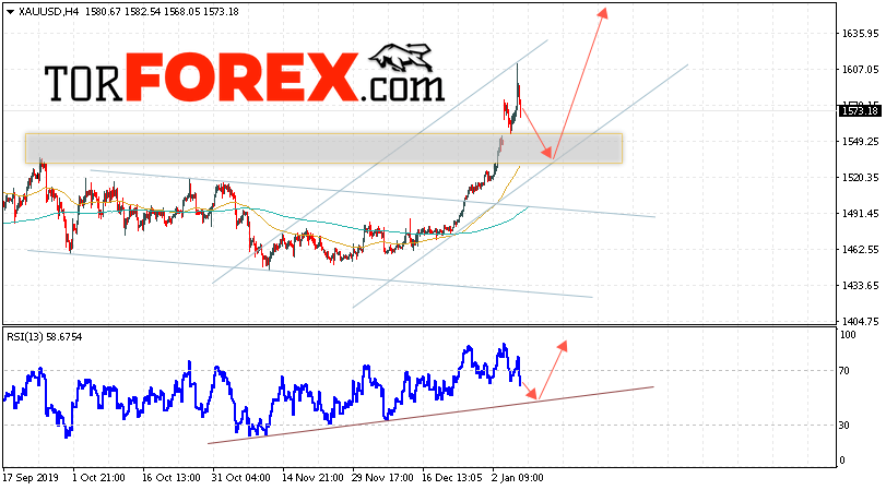 Дополнительным сигналом в пользу роста котировок XAU/USD выступит тест восходящей линии тренда на индикаторе относительной силы. Вторым сигналом в пользу подъёма цен на Золото станет отскок от нижней границы восходящего канала. Отменой варианта роста цен на Золото 9 января 2020 станет падение и пробой уровня 1510. Это укажет на пробой области поддержки и продолжение падения в область ниже уровня 1475. Ожидать ускорения роста котировок XAU/USD стоит с пробоем области сопротивления и закрытием над уровнем 1615.