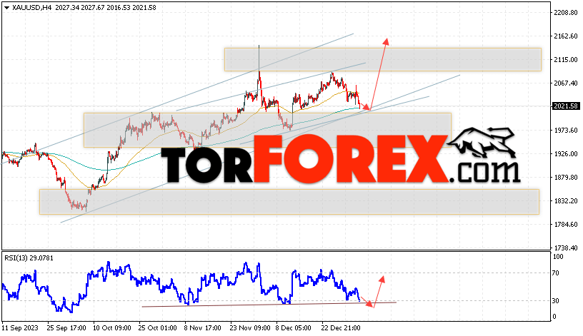 Дополнительным сигналом в пользу роста котировок XAU/USD выступит тест линии сопротивления на индикаторе относительной силы. Вторым сигналом станет отскок от нижней границы бычьего канала. Отменой варианта подъёма цен на Золото 9 января 2024 станет падение цен и пробой уровня 1985. Это укажет на пробой области поддержки и продолжение падения котировок актива в область ниже уровня 1945. Ожидать ускорения роста котировок XAU/USD стоит с пробоем области сопротивления и закрытием цены над уровнем 2070.