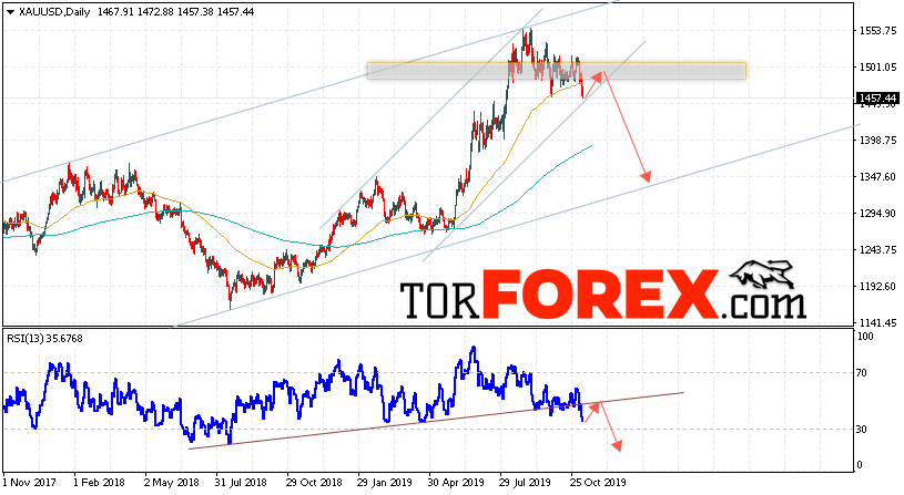 Дополнительным сигналом в пользу падения котировок и цен на Золото на текущей торговой неделе 11 — 15 ноября 2019 выступит тест пробитой линии тренда на индикаторе относительной силы. Вторым сигналом станет отскок от области сопротивления. Отменой варианта падения котировок XAU/USD выступит сильный рост и пробой области 1535. Это укажет на пробой уровня сопротивления и продолжение роста цен на Золото с целью выше уровня 1595. Подтверждением падения стоимости актива выступит пробой нижнем границы восходящего казала и закрытие котировок ниже уровня 1425.