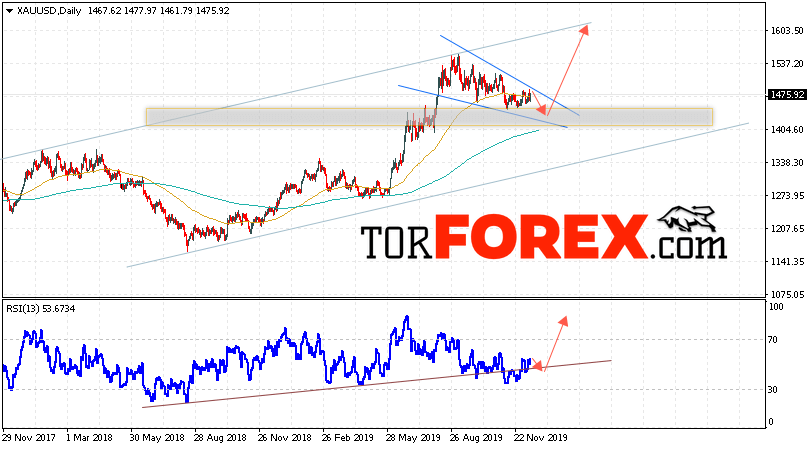 Таким образом, XAU/USD прогноз цен Золота на 16 — 20 декабря 2019 предполагает попытку теста уровня поддержки вблизи области 1465. Затем, продолжение роста цен на Золото с целью выше уровня 1605. В пользу подъёма котировок выступит тест линии тренда на индикаторе относительной силы. Отменой варианта роста Золота станет падение и пробой уровня 1405. Это укажет на продолжение снижения котировок в область ниже уровня 1325.