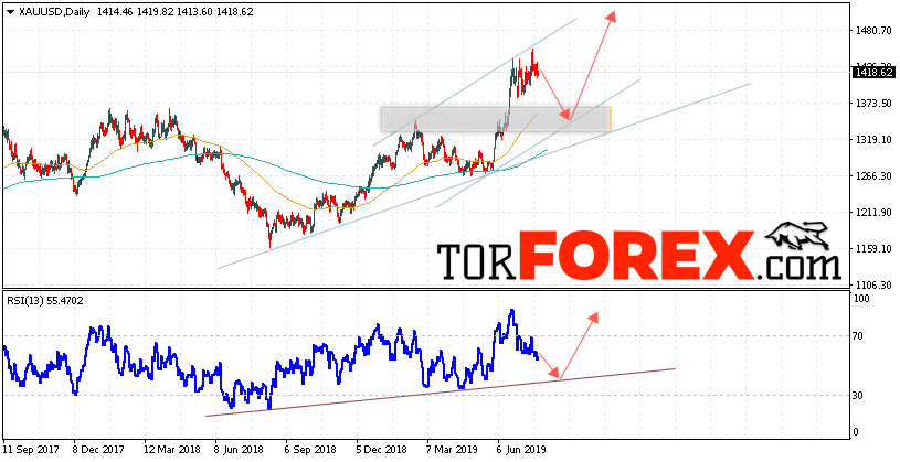 Таким образом, XAU/USD прогноз цен Золота на 29 июля — 2 августа 2019 предполагает попытку теста уровня поддержки вблизи области 1370. Затем продолжение роста цен на Золото с целью выше уровня 1495. В пользу подъёма котировок выступит тест линии тренда на индикаторе относительной силы. Отменой варианта роста Золота станет падение и пробой уровня 1315. Это укажет на продолжение снижения котировок в область ниже уровня 1265.