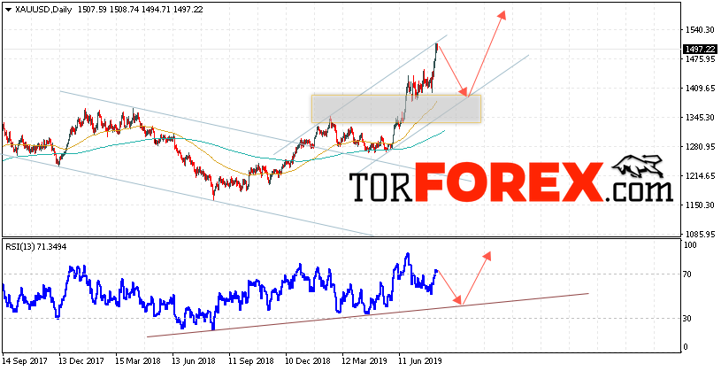 Таким образом, XAU/USD прогноз цен Золота на неделю 12 — 16 августа 2019 предполагает попытку теста уровня поддержки вблизи области 1405. Затем продолжение роста цен на Золото с целью выше уровня 1575. В пользу подъёма котировок выступит тест линии тренда на индикаторе относительной силы. Отменой варианта роста Золота станет падение и пробой уровня 1345. Это укажет на продолжение снижения котировок в область ниже уровня 1295.