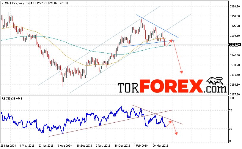 Таким образом, XAU/USD прогноз цен Золота на неделю 22 — 26 апреля 2019 предполагает попытку теста уровня сопротивления вблизи области 1300. Затем продолжение падения цен на Золото с целью ниже уровня 1195. В пользу снижения выступит тест линии тренда на индикаторе относительной силы. Отменой варианта падения Золота станет сильный рост и пробой уровня 1315. Это укажет на продолжение роста котировок в область выше уровня 1365.