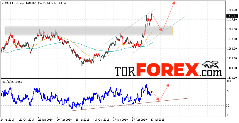 Таким образом, XAU/USD прогноз цен Золота на 22 — 26 июля 2019 предполагает попытку теста уровня поддержки вблизи области 1365. Затем продолжение роста цен на Золото с целью выше уровня 1495. В пользу подъёма котировок выступит тест линии тренда на индикаторе относительной силы. Отменой варианта роста Золота станет падение и пробой уровня 1315. Это укажет на продолжение снижения котировок в область ниже уровня 1265.