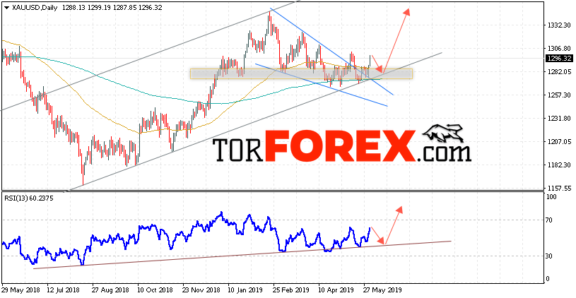 Таким образом, XAU/USD прогноз цен Золота на 3 — 7 июня 2019 предполагает попытку теста уровня поддержки вблизи области 1285. Затем продолжение роста цен на Золото с целью выше уровня 1365. В пользу подъёма котировок выступит тест линии тренда на индикаторе относительной силы. Отменой варианта роста Золота станет падение и пробой уровня 1255. Это укажет на продолжение снижения котировок в область ниже уровня 1220.