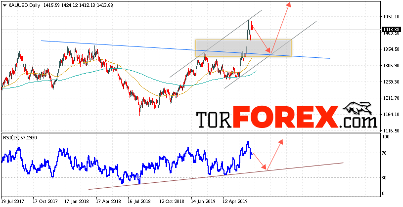 Таким образом, XAU/USD прогноз цен Золота на 8 — 12 июля 2019 предполагает попытку теста уровня поддержки вблизи области 1355. Затем продолжение роста цен на Золото с целью выше уровня 1495. В пользу подъёма котировок выступит тест линии тренда на индикаторе относительной силы. Отменой варианта роста Золота станет падение и пробой уровня 1305. Это укажет на продолжение снижения котировок в область ниже уровня 1255.