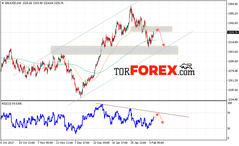 Котировки Золота XAU/USD продолжают движение в рамках коррекции. На данный момент стоит ожидать попытку теста уровня сопротивления вблизи уровня 1330. Откуда стоит ожидать отскок и продолжения падения цены на Золото с целью ниже уровня 1300.