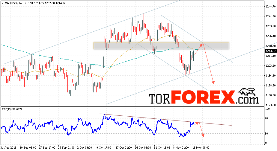 Таким образом, XAU/USD прогноз цен на Золото на 16 ноября 2018 предполагает попытку теста области сопротивления вблизи уровня 1220. Затем продолжение снижения котировок с целью ниже уровня 1190. Отменой варианта снижения цен на Золото выступит сильный рост и пробой уровня 1225. Это укажет на пробой верхней границы канала. В этом случае стоит ожидать продолжения роста Золота выше уровня 1240.