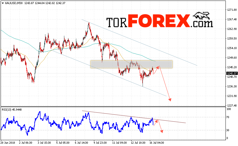 Таким образом, XAU/USD прогноз цен на Золото на 17 июля 2018 предполагает попытку теста области сопротивления вблизи уровня 1245 и продолжения падения котировок с целью ниже уровня 1225, отменой варианта падения цен на Золото выступит пробой уровня 1255, что укажет на выход котировок за пределы канала, в этом случае стоит ожидать продолжения роста в область выше уровня 1265.